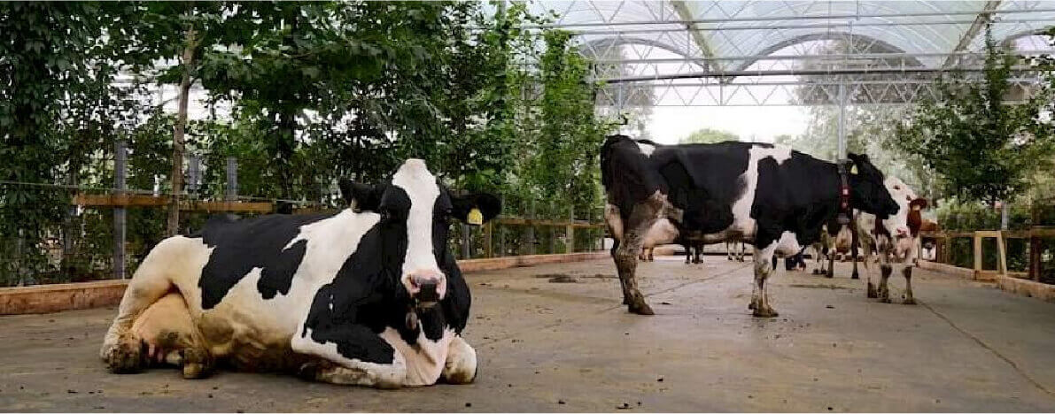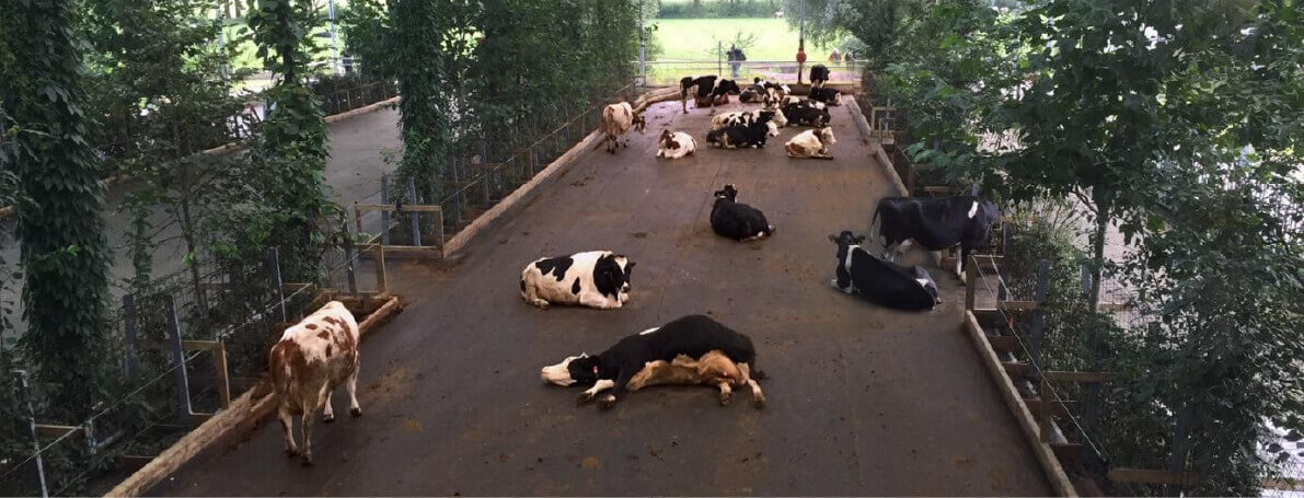 L’urina viene raccolta in contenitori posti sul fondo del pavimento e trasportata tramite tubi a un sistema di stoccaggio. Il primo allevamento ad adottare questo tipo di pavimento combina la sua presenza con alberi all’interno della stalla. Questi alberi non solo migliorano l’aspetto estetico dell’edificio ma forniscono anche ombra per le bovine, filtrando la luce attraverso un tetto trasparente. Questo innovativo tipo di struttura è conosciuto come giardino per bovine.